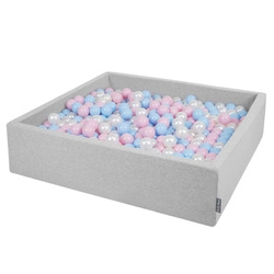 KiddyMoon Suchy basen kwadratowy z piłeczkami 7cm 120x30 Zabawka basen piankowy, jasnoszary: babyblue-pudrowy róż-perła