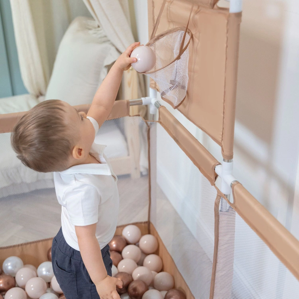 Składany kojec z plastikowymi piłkami w kształcie mini-boiska zapewni Twojemu dziecku godziny zabawy. Wewnątrz jest wystarczająco dużo przestrzeni, aby w zabawie mogło uczestniczyć swobodnie kilkoro dzieci. Jednocześnie kojec można w łatwy sposób złożyć, dzięki czemu można go schować, lub zabrać ze sobą na wczasy, piknik, czy do znajomych. Jedna ze ścianek jest wyposażona w siatkowy kosz do koszykówki umożliwiając małym dzieciom rywalizację w grze zespołowej.