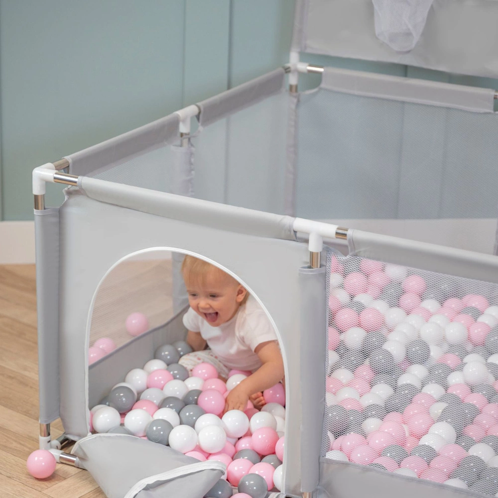 Składany kojec z plastikowymi piłkami w kształcie mini-boiska zapewni Twojemu dziecku godziny zabawy. Wewnątrz jest wystarczająco dużo przestrzeni, aby w zabawie mogło uczestniczyć swobodnie kilkoro dzieci. Jednocześnie kojec można w łatwy sposób złożyć, dzięki czemu można go schować, lub zabrać ze sobą na wczasy, piknik, czy do znajomych. Jedna ze ścianek jest wyposażona w siatkowy kosz do koszykówki umożliwiając małym dzieciom rywalizację w grze zespołowej.