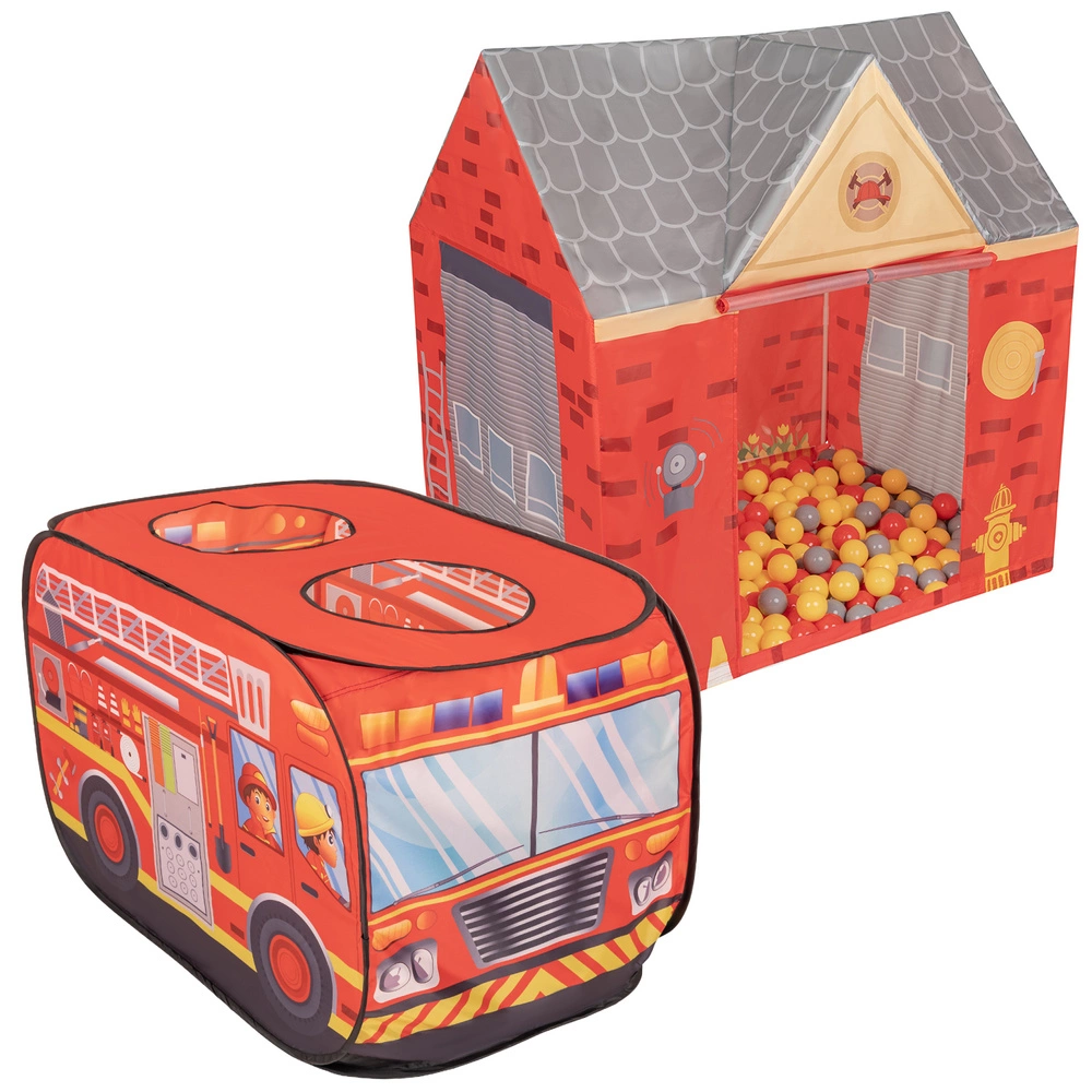 Domek do zabawy PH-400X + Wóz strażacki PH-500X z piłeczkami 6cm Zabawka namiot dla dzieci, czerwony: szary-żółty-czerwony
