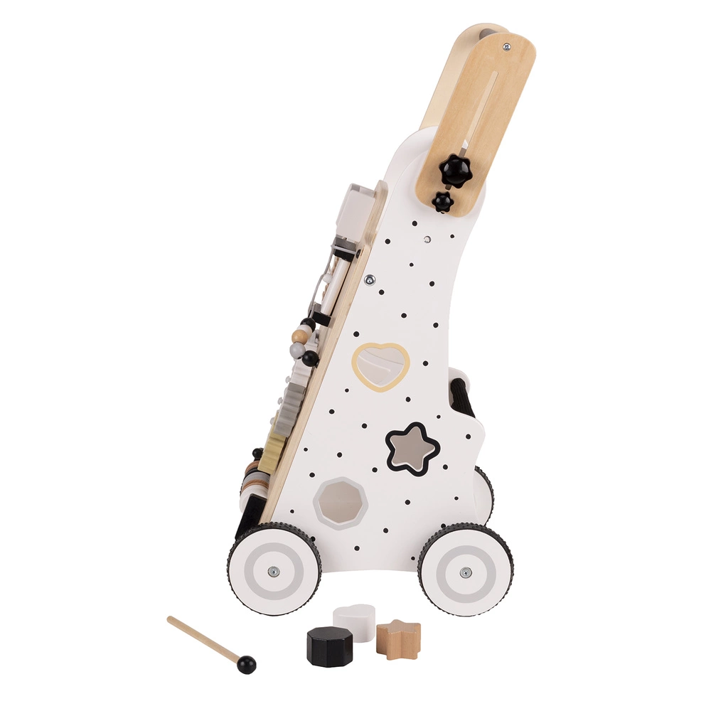 Stabilny chodzik to zabawka, która towarzyszy dziecku przy stawianiu pierwszych kroków jak również edukacyjne centrum rozrywki, które rozwija motorykę dziecka. Każda ze ścian pchacza ma zupełnie inną funkcjonalność i charakter. Pozwala to na bardzo ciekawą zabawę, która nigdy się nie znudzi i będzie stymulowała rozwój malucha: liczydło i cymbałki, labirynt, ruchome kulki i trybiki, lusterko i ruchoma układanka. Chodzik ma też funkcję pojemnika na zabawki, a dzięki siatce rzeczy są zabezpieczone przed wypadnięciem. Posiada antypoślizgowe koła. Zabawka wykonana z certyfikowanego drewna wysokiej jakości, w pełni bezpieczna, pokryta nietoksyczną farbą. Wariant z regulowaną rączką pozwala dostosować chodzik do wzrostu dziecka.