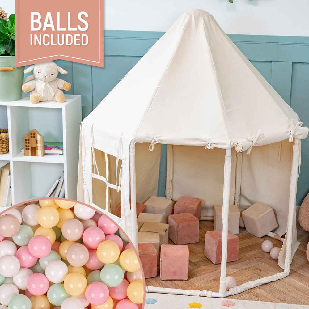 KiddyMoon Namiot dla dzieci NK-002 z piłeczkami 7cm Zabawka namiot dla dzieci, natural: pastelowy beż-pastelowy żółty-biały-mięta-pudrowy róż