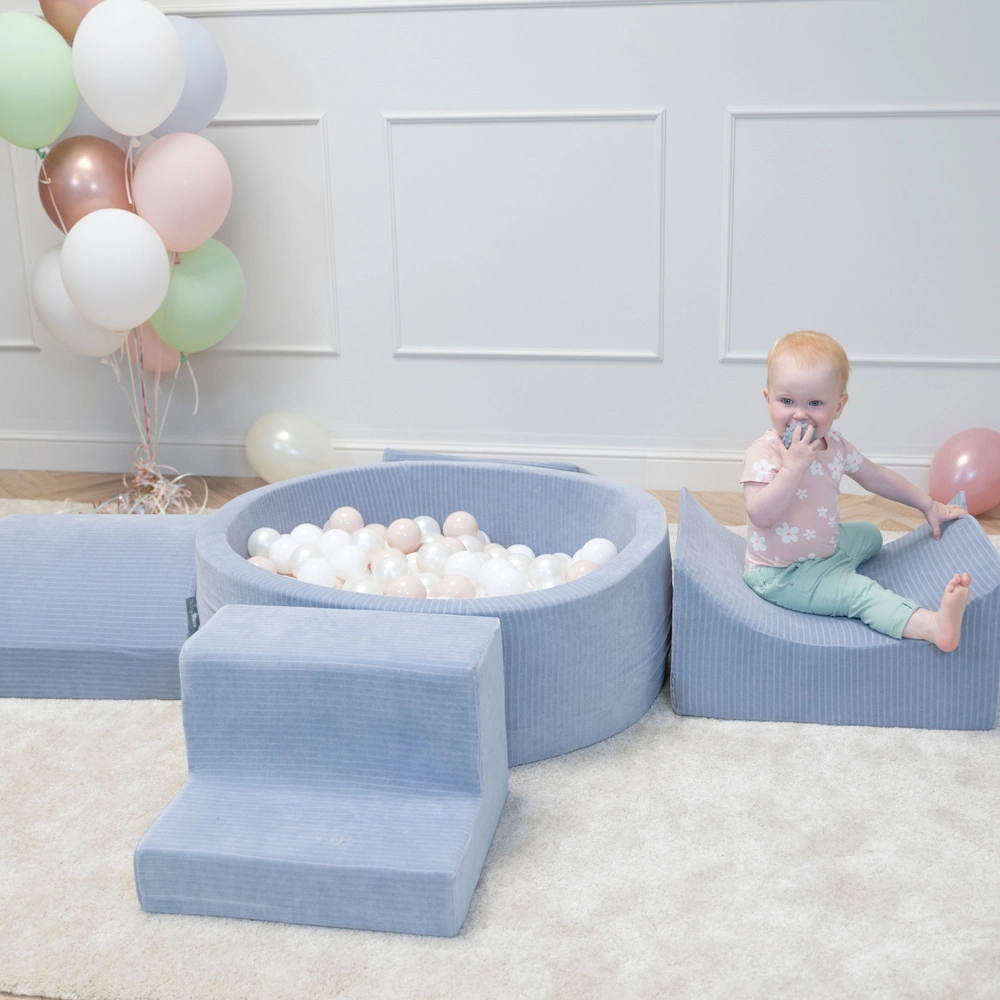 Piankowy zestaw z piłeczkami dla dzieci wykonany z przyjemnej w dotyku prążkowanej dzianiny.