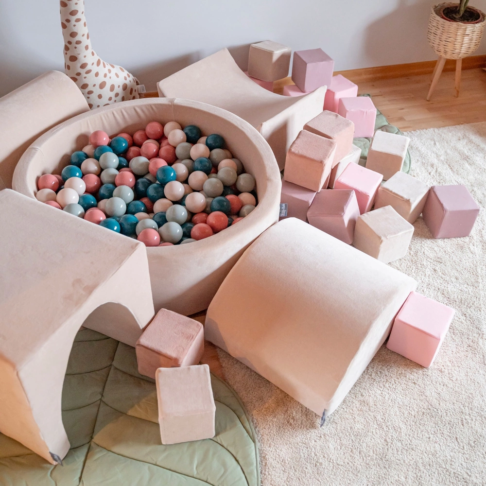 KiddyMoon Plastikowe piłeczki 7cm Zabawka zestaw kulek, ciemny turkus-pastelowy beż-zielonoszary-łososiowy
