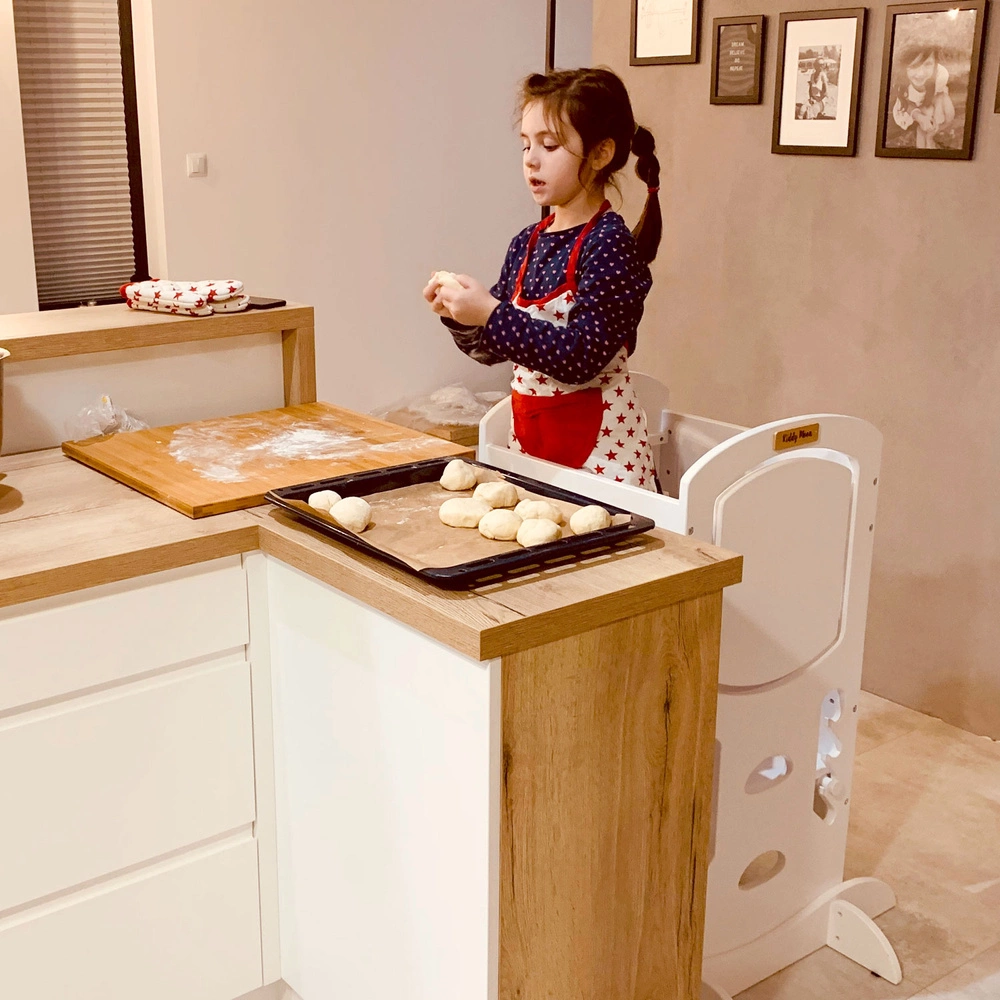 Mieszanie, zagniatanie, lepienie, smarowanie - dzieci uwielbiają uczestniczyć w przygotowaniuposiłków. Kitchen helper pozwala poczuć im się trochę jak dorosły. Twoje dziecko chciałoby pomagać ci w kuchni, potrzebuje sięgnąć zlewu w łazience lub blatu, a jest jeszcze za niskie? Kitchen helper umożliwia dzieciom uczestniczenie w takich aktywnościach w bezpieczny sposób. Dzięki temu Twoje dziecko może rozwijać swoje umiejętności manualne i towarzyszyć Ci w codziennychaktywnościach, tym samym wzmacniając naturalną więź między dzieckiem, a rodzicem. Ponadto unikniesz wdrapywania się twojego malucha na krzesła lub taborety, skąd może łatwo spaść.
