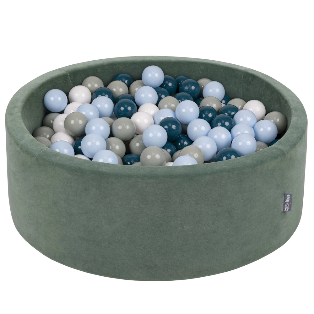 KiddyMoon Suchy basen okrągły VELVET z piłeczkami 7cm Zabawka basen piankowy, zieleń lasu: ciemny turkus-zielonoszary-pastelowy niebieski-biały