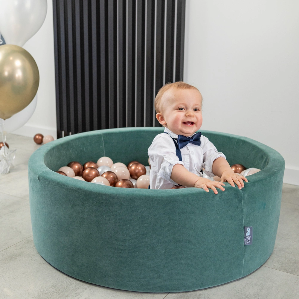 KiddyMoon Suchy basen okrągły VELVET z piłeczkami 7cm Zabawka basen piankowy, zieleń lasu: jasny zielony-zielony-żółty-pudrowy róż-róż