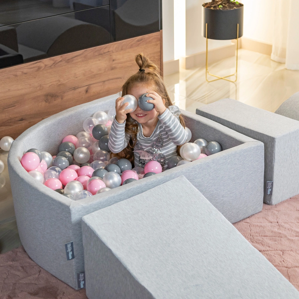 W zestawie z suchym basenem znajduje się 200 lub 300 sztuk kolorowych bezpiecznych dla dzieci piłeczek o średnicy 7 cm. Piłeczki wyprodukowane są w Europie z nietoksycznego materiału. Posiadają certyfikat CE. Przyjemne i lekkie a zarazem elastyczne i odporne na zniekształcenia: po ściśnięciu odzyskują swój pierwotny kształt nie robiąc dziecku krzywdy.